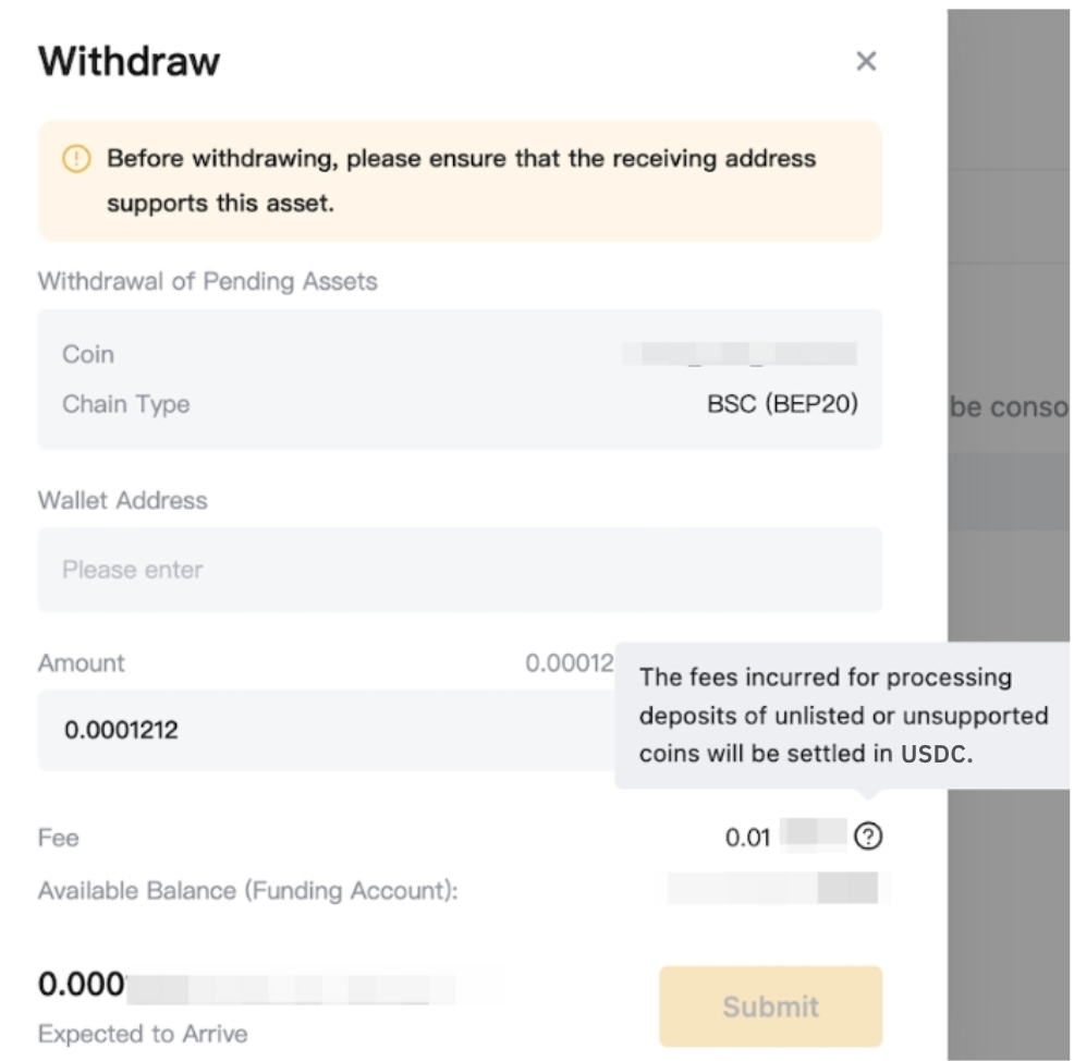 Führen Sie eine Auszahlung Ihrer nicht unterstützten Vermögenswerte aus dem Seite „ Ausstehend Vermögen“ zu einer externen Plattform/Wallet, die die Wiederherstellungsmünze und -kette unterstützt.