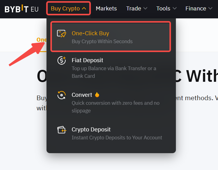 Step 1: Click on Buy Crypto One-Click Buy on the top left corner of the navigation bar to enter the One-Click Buy page.