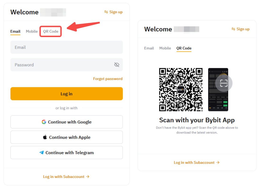 Step 1: Please head to the login page on the Bybit EU website and click on the interactive yellow QR code in the upper right corner.