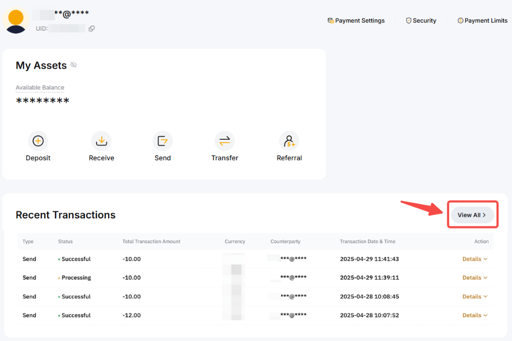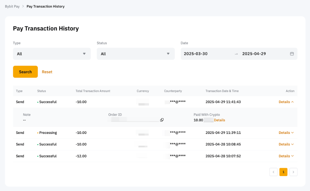 To view your payment history, please head to the Bybit Pay page, scroll to the bottom, and click View All. Alternatively, simply go to Pay Transaction History.