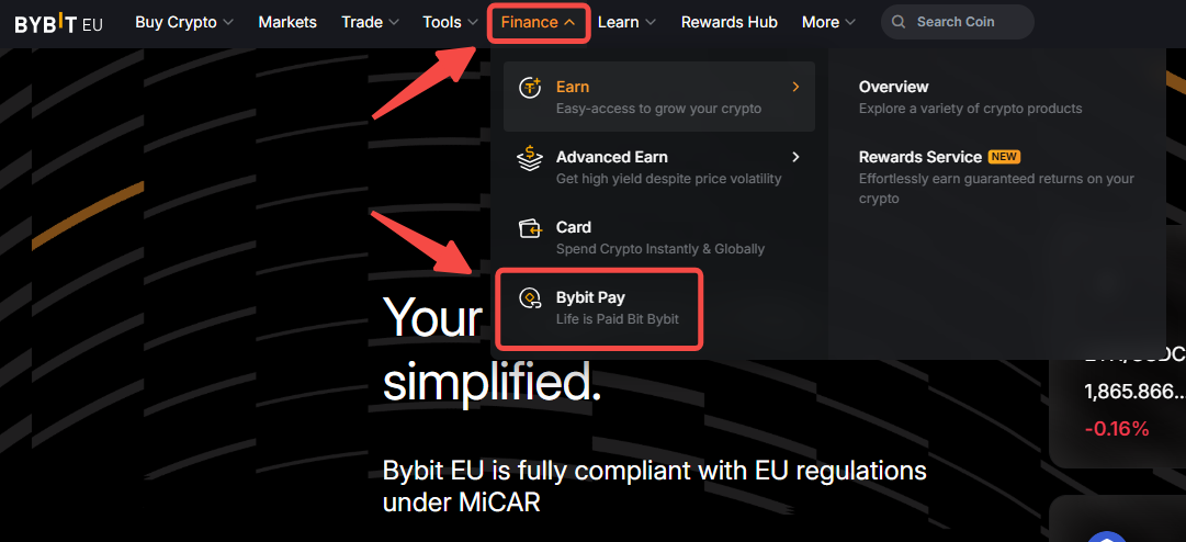Step 1: From the Bybit EU homepage, click on Finance → Bybit Pay in the navigation bar to enter the Bybit Pay page. Then, click on the Send button.