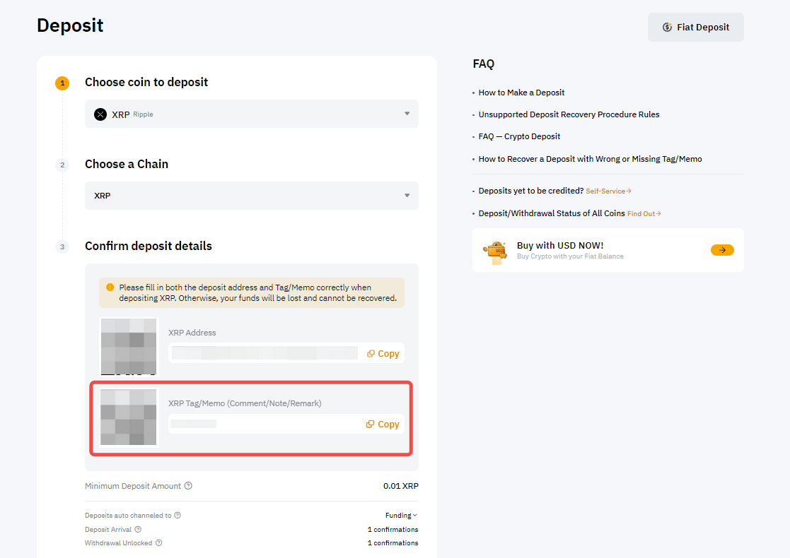 — For coin deposits that require a deposit tag/memo, such as XRP, EOS, TON chain and more, kindly be sure to fill in your deposit memo/tag correctly in the Comment/Note/Remark field of your withdrawal request page. You can find your memo/tag from the deposit window as shown below. Depositing without a memo/tag or with the wrong memo/tag may lead to the loss of assets. For more information, please refer to the FAQ — On-chain Crypto Deposits.