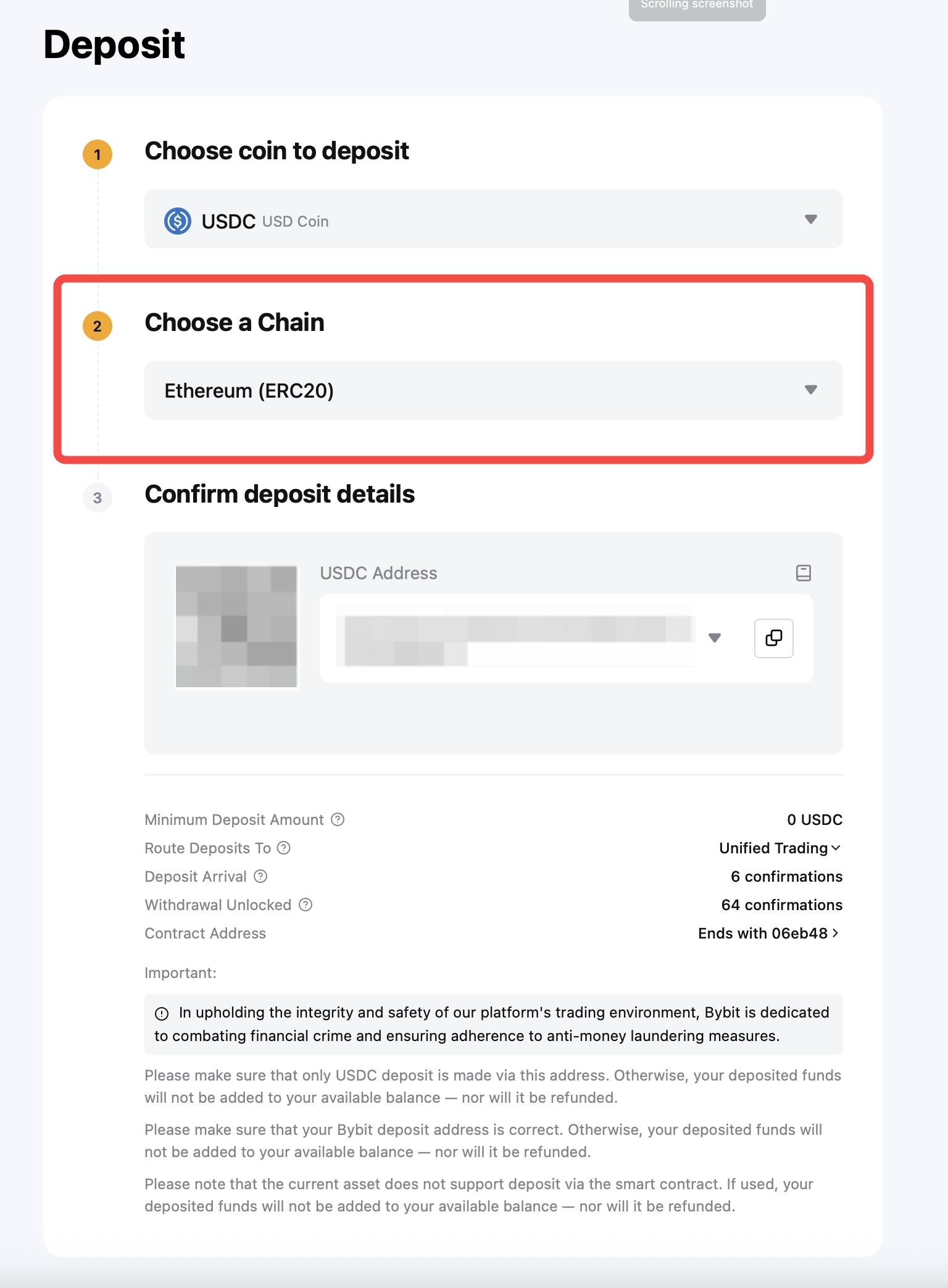 Step 3: Select the chain type that you will use. After acknowledging the information message, you’ll see your Bybit EU deposit address. You can either scan the QR code or copy the deposit address and use it as the destination address to which you can send the funds.