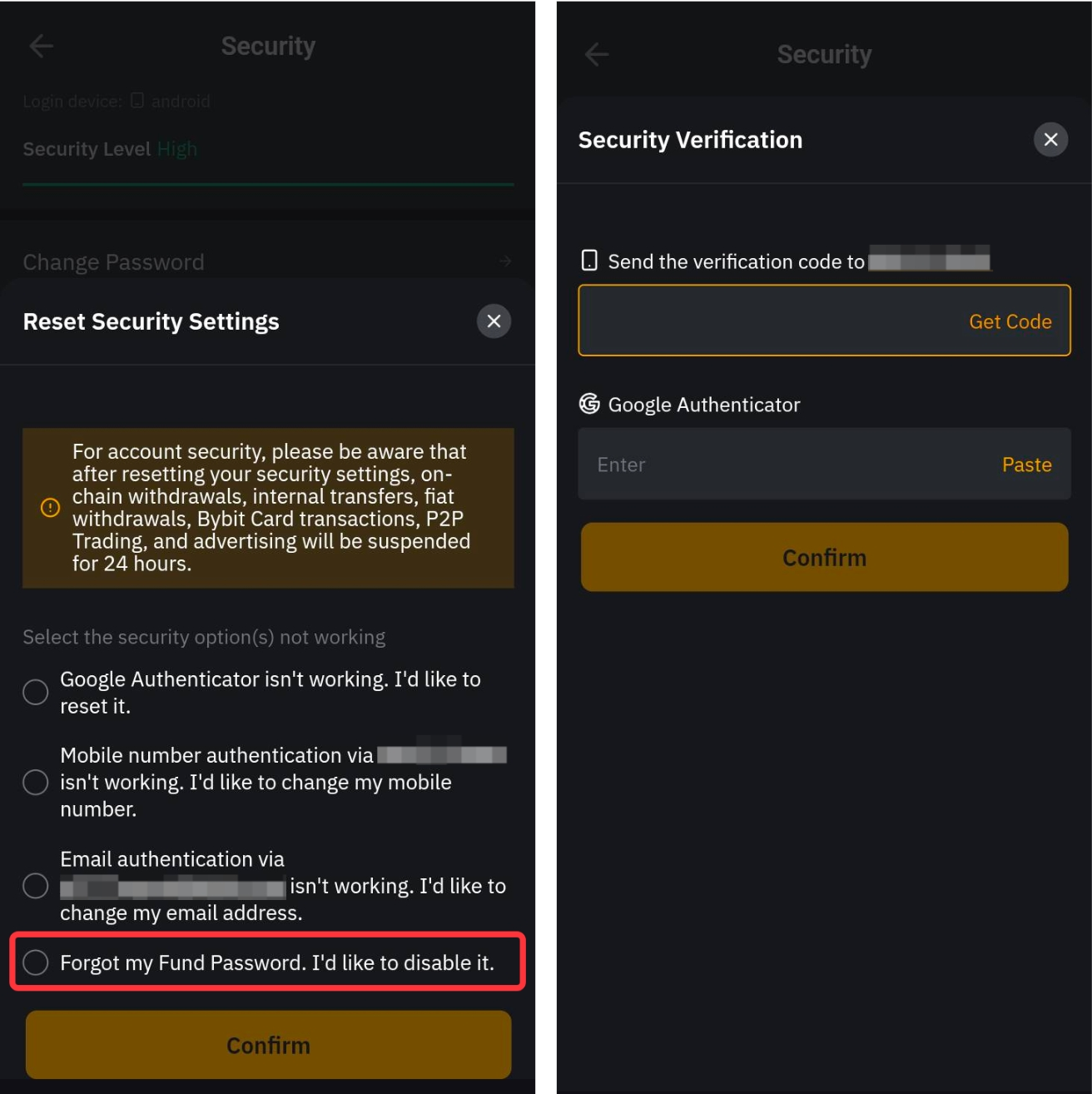 1. Please tap on Having problems with verification? in the Disable Fund Password window, or