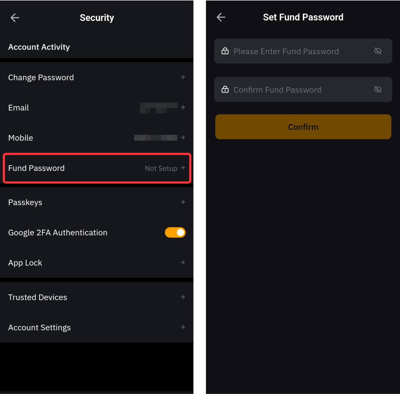 A Fund Password is an extra layer of security to your account, which is different from the account login password. It will be required for security verification and withdrawals if the user has set up a Fund Password.