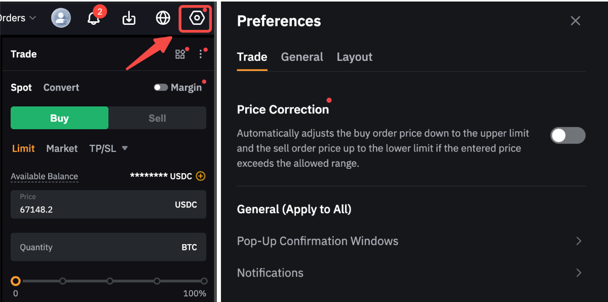 Price Correction | acts like "auto-correct" for your buy and sell orders. If you accidentally type a price that is way off—like trying to buy a coin for much higher than its current value due to a typo—this feature steps in to save you. Instead of letting you overpay, it automatically adjusts your order to the current best market price, ensuring you get a fair deal even if you made a mistake entering the numbers. |