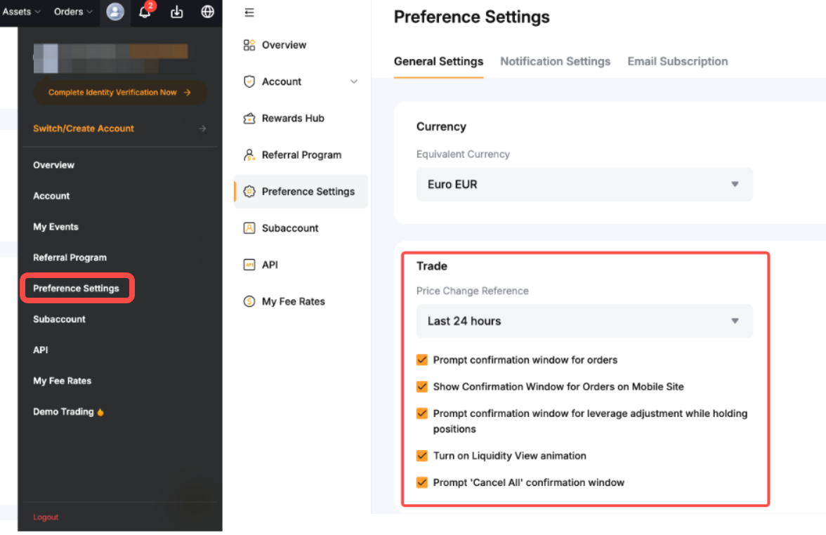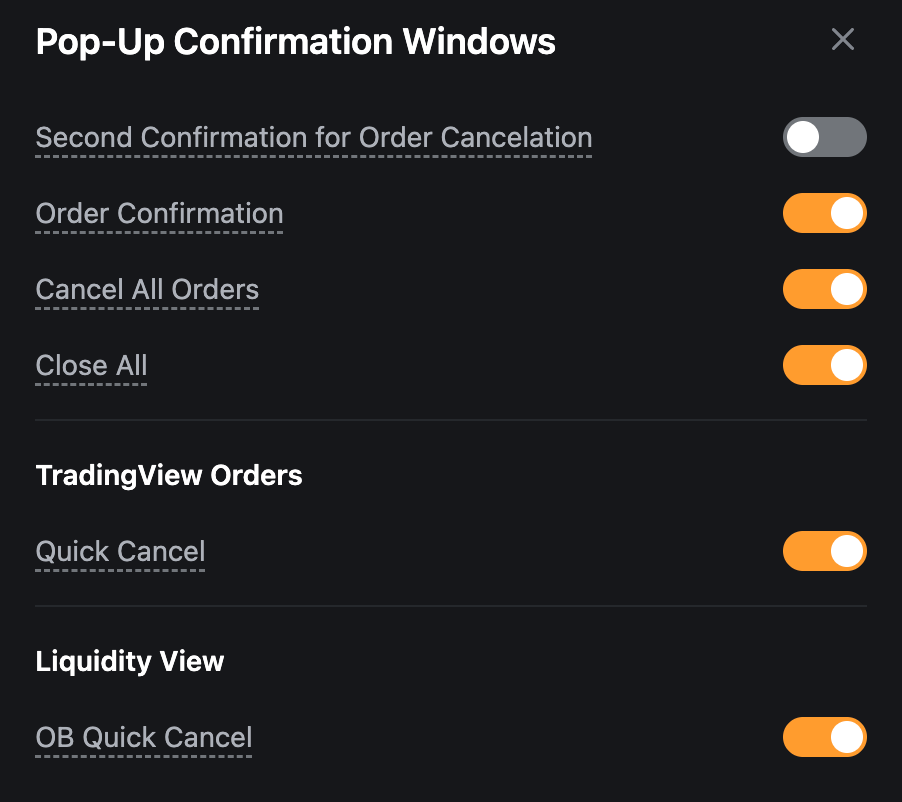 Bybit EU highly recommends having at least the Order Confirmation, Quick Reverse, Close All and Cancel All confirmation windows enabled to avoid any wrong actions. |