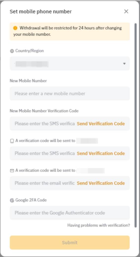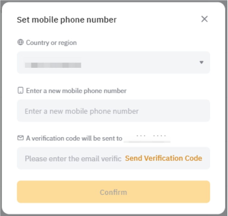 Step 2: Enter your new country code and phone number. Then, click on the different Send Verification Code buttons to proceed with the old mobile, new mobile and/or email verification steps as well as the Google 2FA verification, if enabled. Once you have entered the required verification codes, click on Confirm.