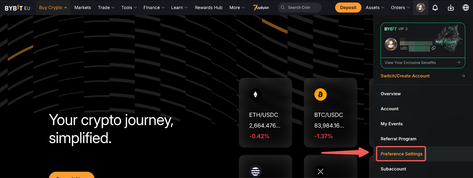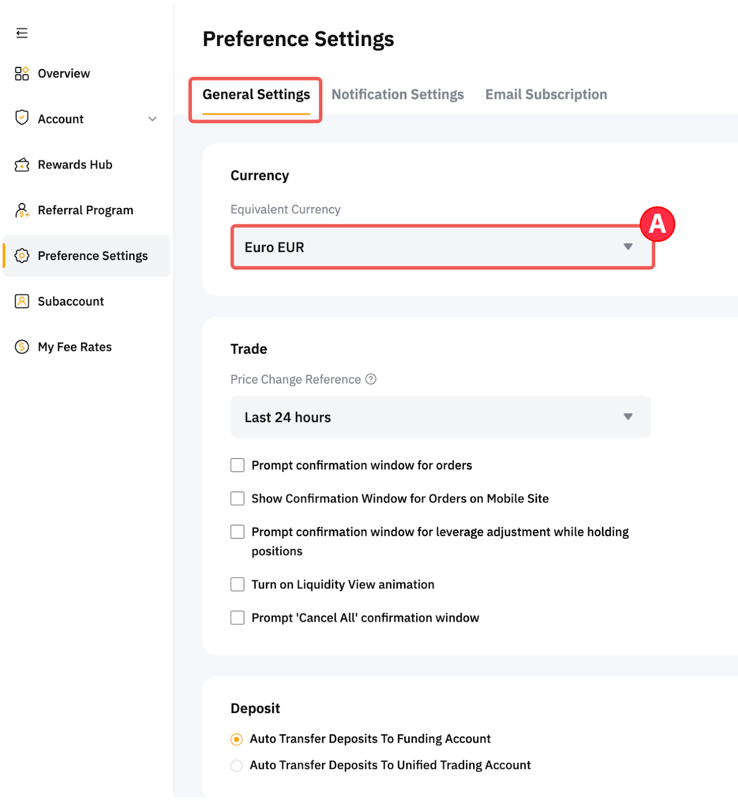 Select your preferred currency for display on the Bybit EU website in the General Settings tab. This currency will be used to give you an estimate of your funds and order amounts to better grasp the value in your account.