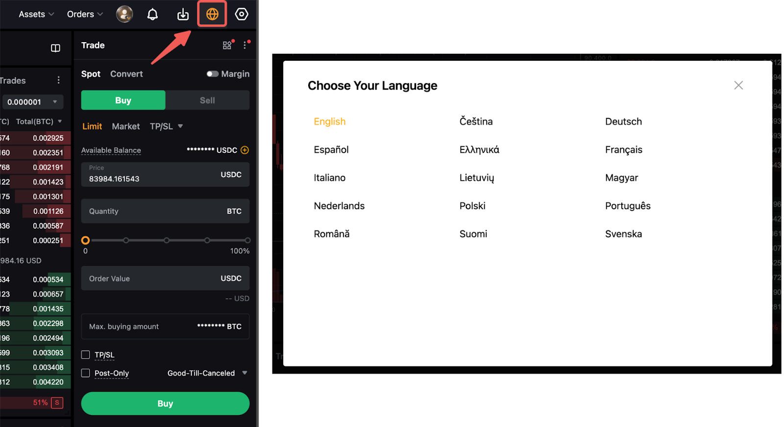 On the top right corner of the website, click on the globe icon to open the list of available languages and select your preferred language.