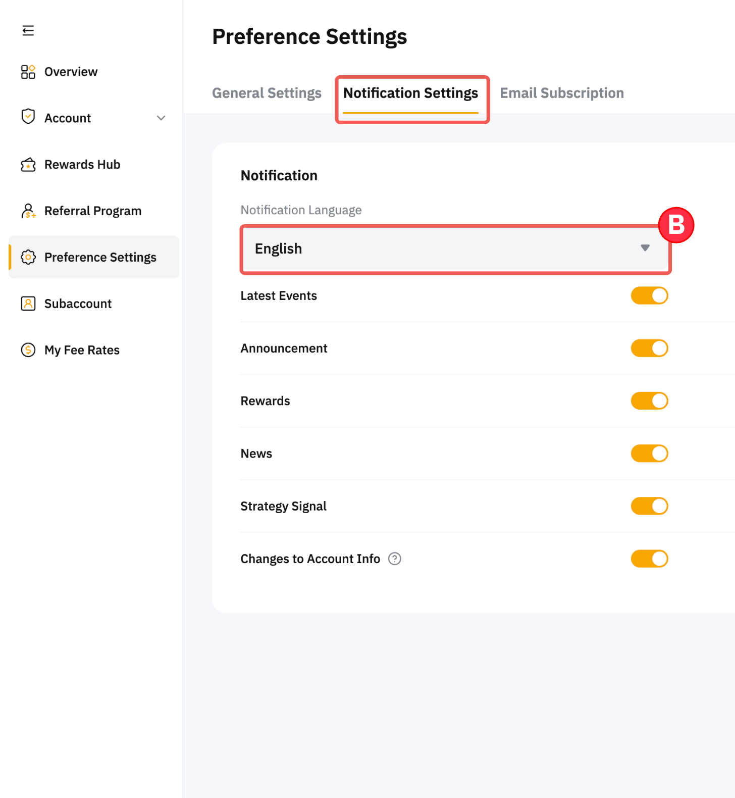 Select your preferred notification language inside the drop-down menu in the Notification Settings tab. Please note that this language setting only applies to the email notifications you receive. To modify the language of the website or pop-up notifications, please refer to this guide.