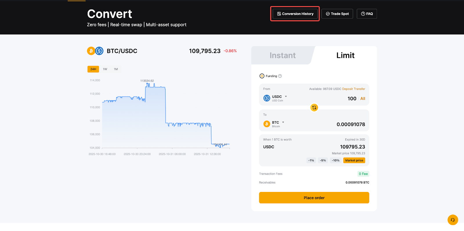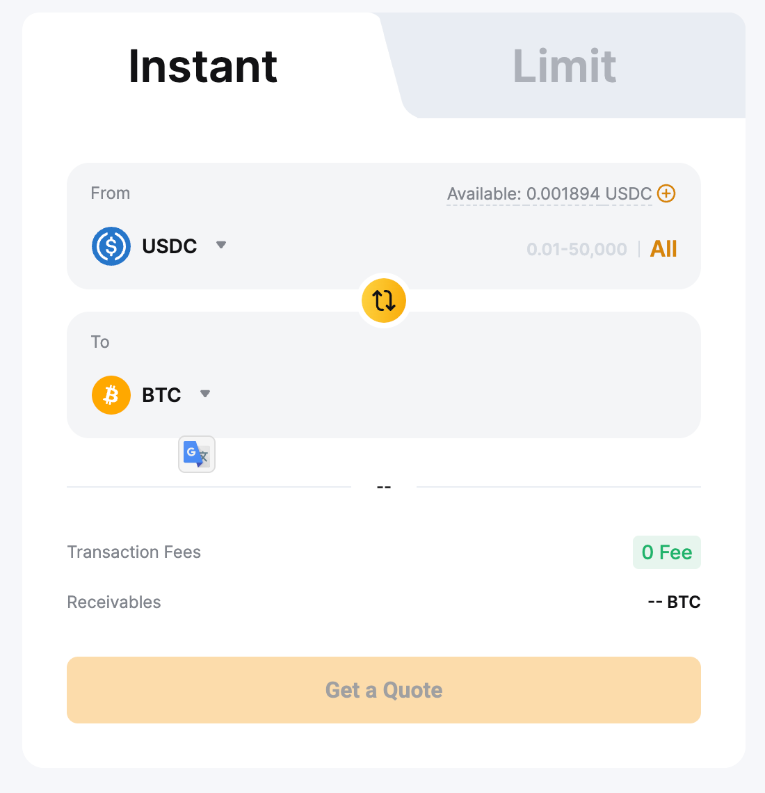 - Instant mode: Your assets will be converted immediately at the quoted price displayed on the page once you confirm the transaction.
