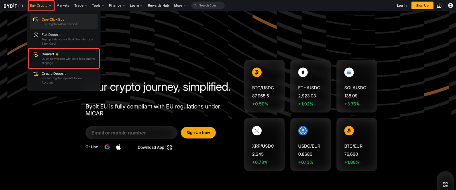 Step 1: Select Buy Crypto in the top navigation bar and click Convert.