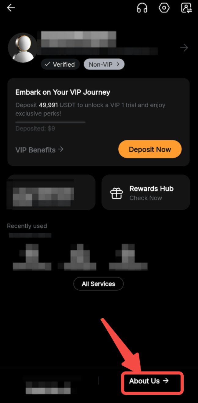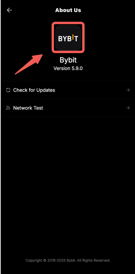 Step 3: On the About Us page, double-tap the Bybit EU logo near the top of the screen. This will open a hidden “Send Log” option at the bottom of the page.