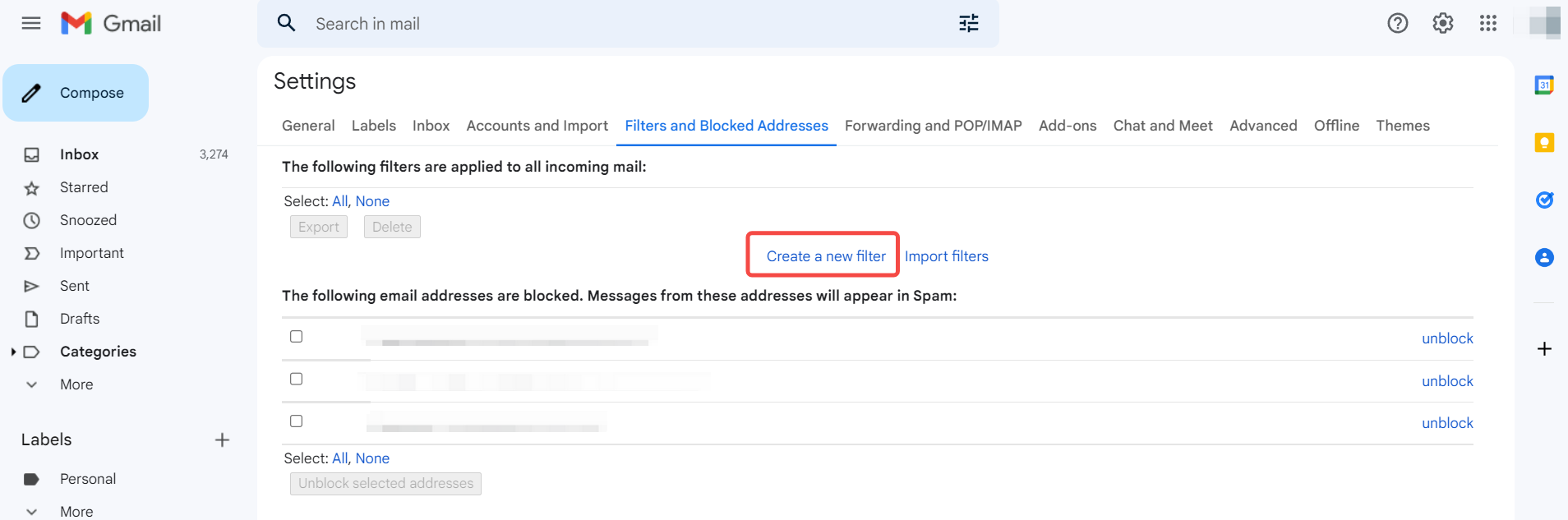 Step 1: Click on your Gmail account settings, and select Filters and Blocked Addresses.