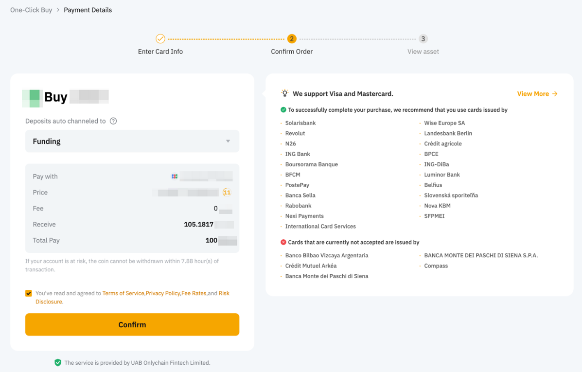Currently, Visa and Mastercard payments are supported. Please also complete identity verification before purchasing coins. To learn more about KYC requirements, please refer to FAQ — Bank Payments.