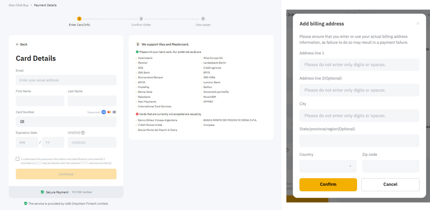 Step 3: Enter your bank card information and click on Continue once done. Ensure that your bank card is supported by checking the information box on the right. You may be required to fill in the billing address. Please ensure that the billing address entered matches your bank card’s registered address.