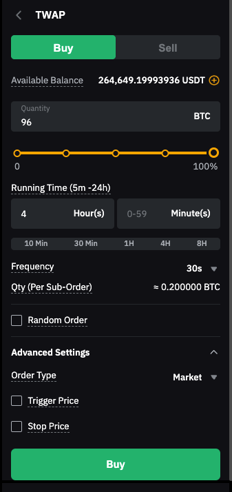 Con 14 400 segundos, la estrategia TWAP dividirá 96 BTC en 480 órdenes (14 400 s/30 s). En el plazo total de 4 horas, se realizará una orden de mercado de 0,2 BTC (96 órdenes BTC/480) cada 30 segundos.