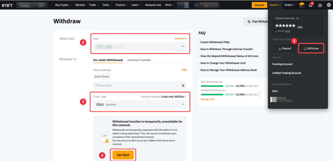 Veuillez noter que les actions considérées comme des retraits incluent le retrait de Crypto On-Chain, le Transfert interne ou le retrait Fiat. Pour plus d'informations, veuillez vous référer aux Raisons courantes des Demande de retrait infructueuses.