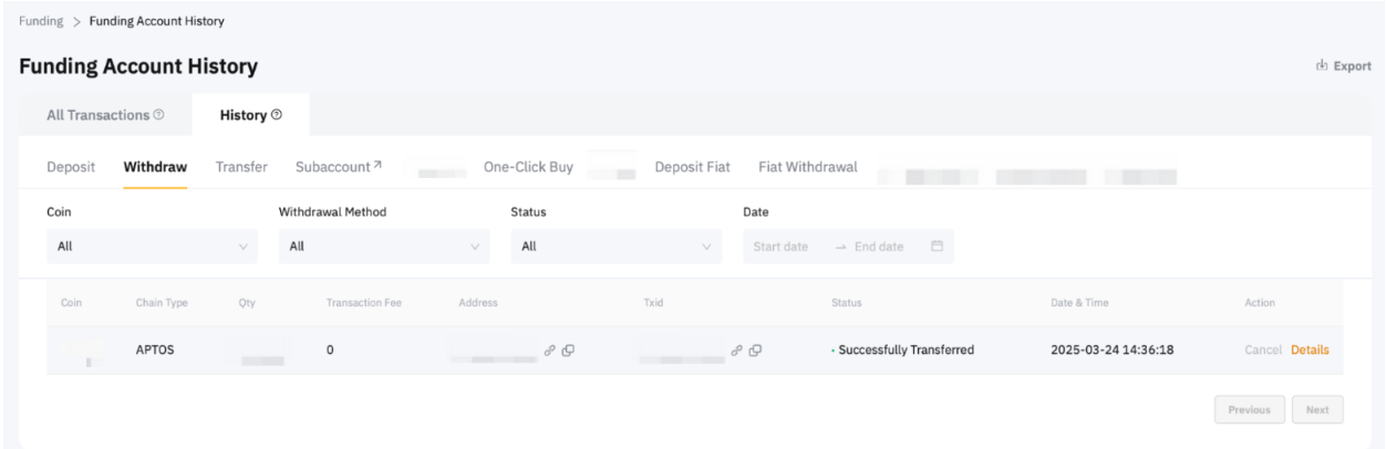 Vous pouvez obtenir le TXID à partir de la page Historique de Financement → Retrait et cliquez sur les détails pour vérifier votre adresse de retrait et votre TXID.