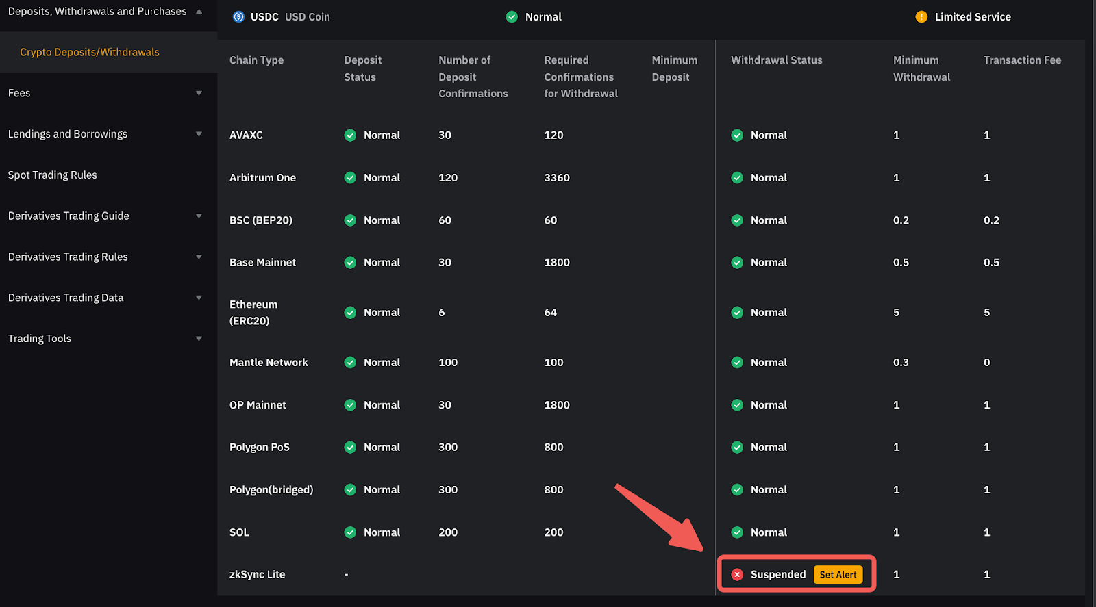 Autrement, vous pouvez aller à la Page d'état des dépôts/retraits et recherchez la crypto et la chaîne. Le bouton Définir une alerte sera visible à côté du statut de dépôt « Suspendu ».