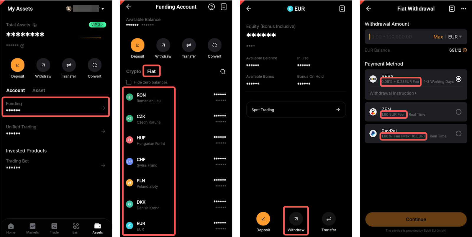 - Utilisez des méthodes de paiement avec le même nom que votre KYC européen Bybit. Il est strictement interdit d’utiliser des comptes tiers pour des transferts de paiement.