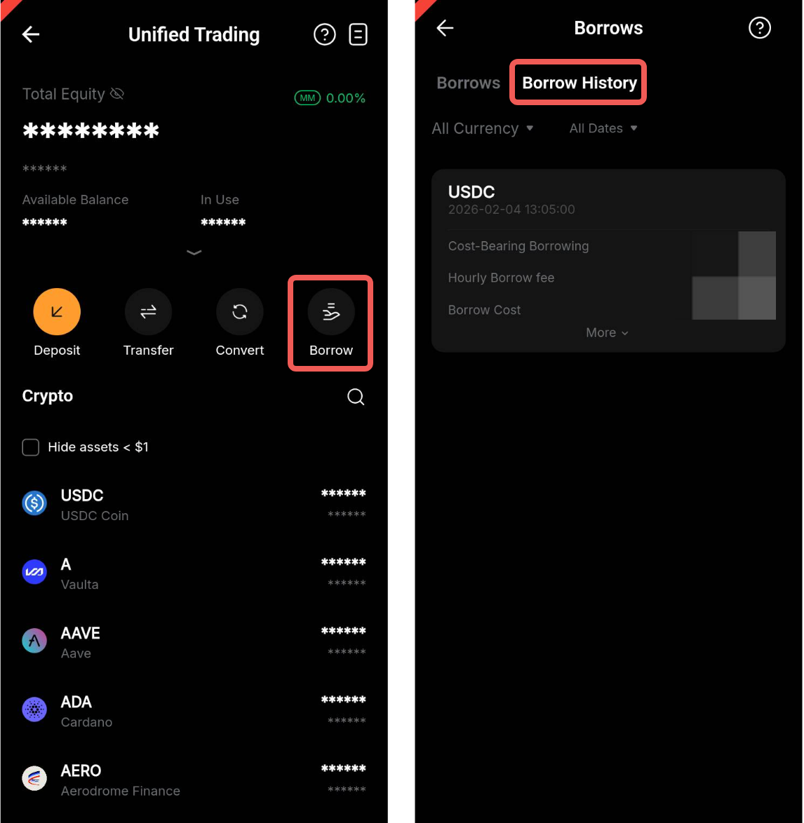 Sull'app, vai alla pagina degli Asset → Account di trading unificato e tocca su Prestiti per visualizzare la cronologia dei prestiti.