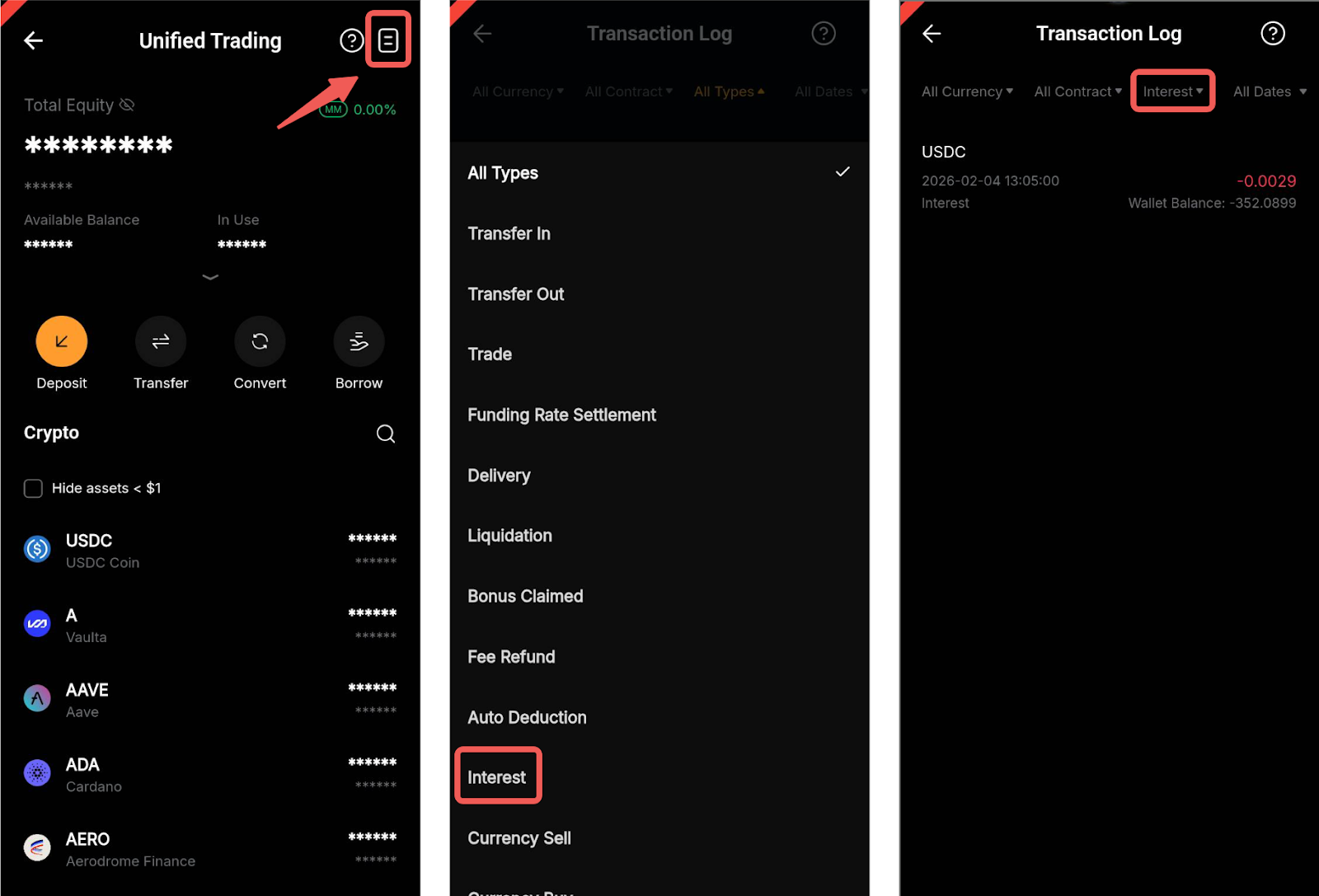 Sull'app, vai a Asset → Account di trading unificato → Registro delle transazioni e filtra i rispettivi tipi di transazione.