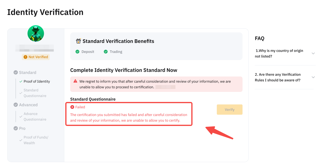 Le seguenti sono ragioni comuni e soluzioni per i fallimenti della verifica KYC: