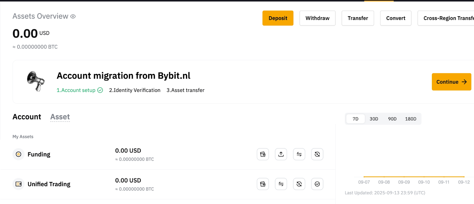 After 30 Sep 8:00 AM UTC, log in to Bybit EU, complete identity verification (with the same identity as your NL account), and finish the asset transfer.