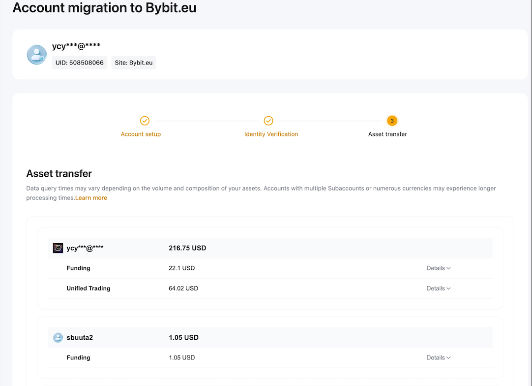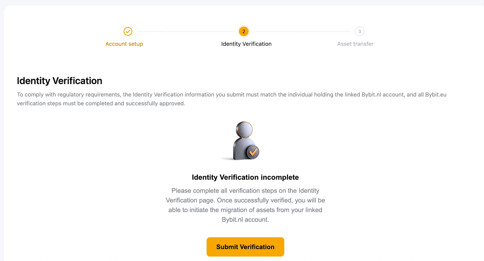 If you already have a Bybit EU account, it will be linked automatically. Simply complete identity verification (with the same identity on the NL account) and then initiate the asset transfer.