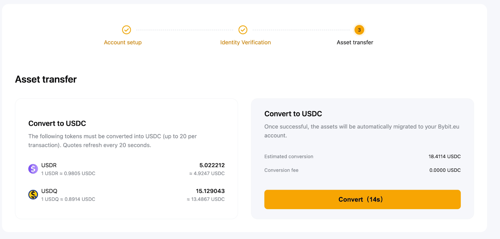 During this period, the migration tools on Bybit EU (asset and card transfer functions) will be temporarily unavailable. They will resume after 30 Sep 2025, 8:00 AM UTC. Please refer to the FAQ below for details.