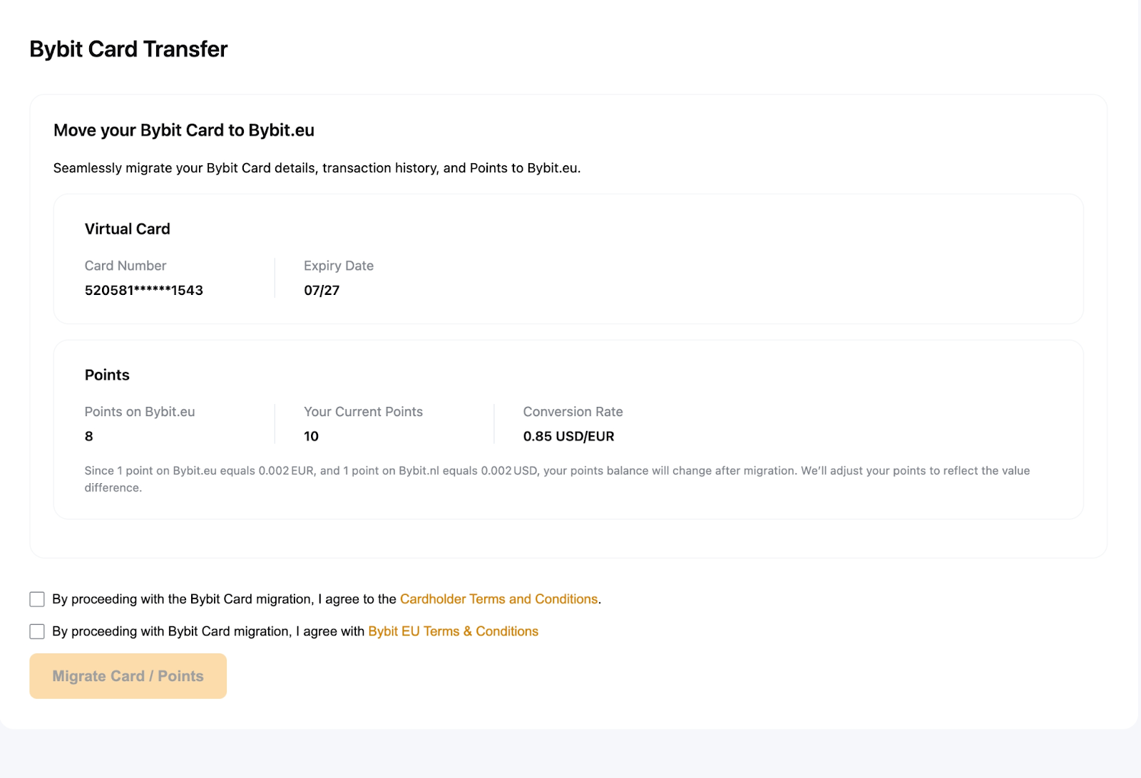 Step 5 : If you have a Bybit NL card, you can migrate your card and points to Bybit EU.