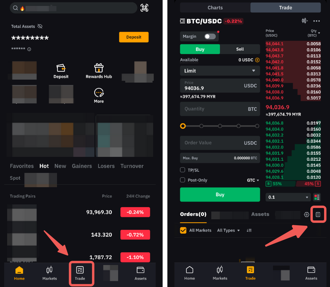 Sull’app Bybit EU: vai su Trade, apri la pagina Spot Trading, quindi tocca Trade. Non appena carichi, clicca sull’icona Cronologia ordini in alto a destra nella sezione dell’ordine per visualizzare cronologia ordini e transazioni.