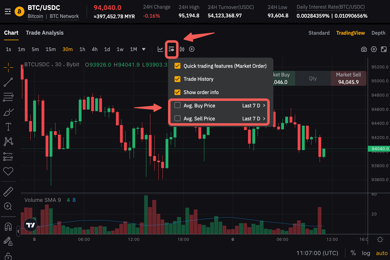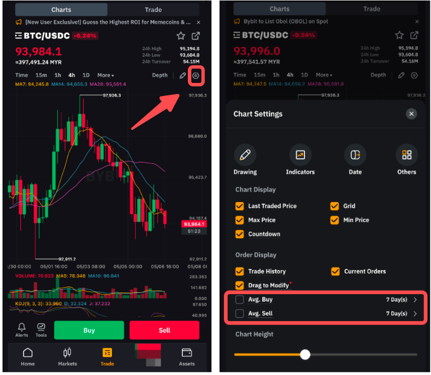 Durante il Trading Spot, puoi visualizzare il prezzo medio dei tuoi ordini di Acquisto e Vendita direttamente nel grafico di trading. Per attivare questa funzione, clicca sull’icona Display e seleziona il tipo di prezzo medio da visualizzare. È anche possibile selezionare l’intervallo di tempo per il calcolo della media (ultimi 7, 30, 60 o 90 giorni).
