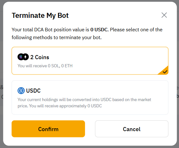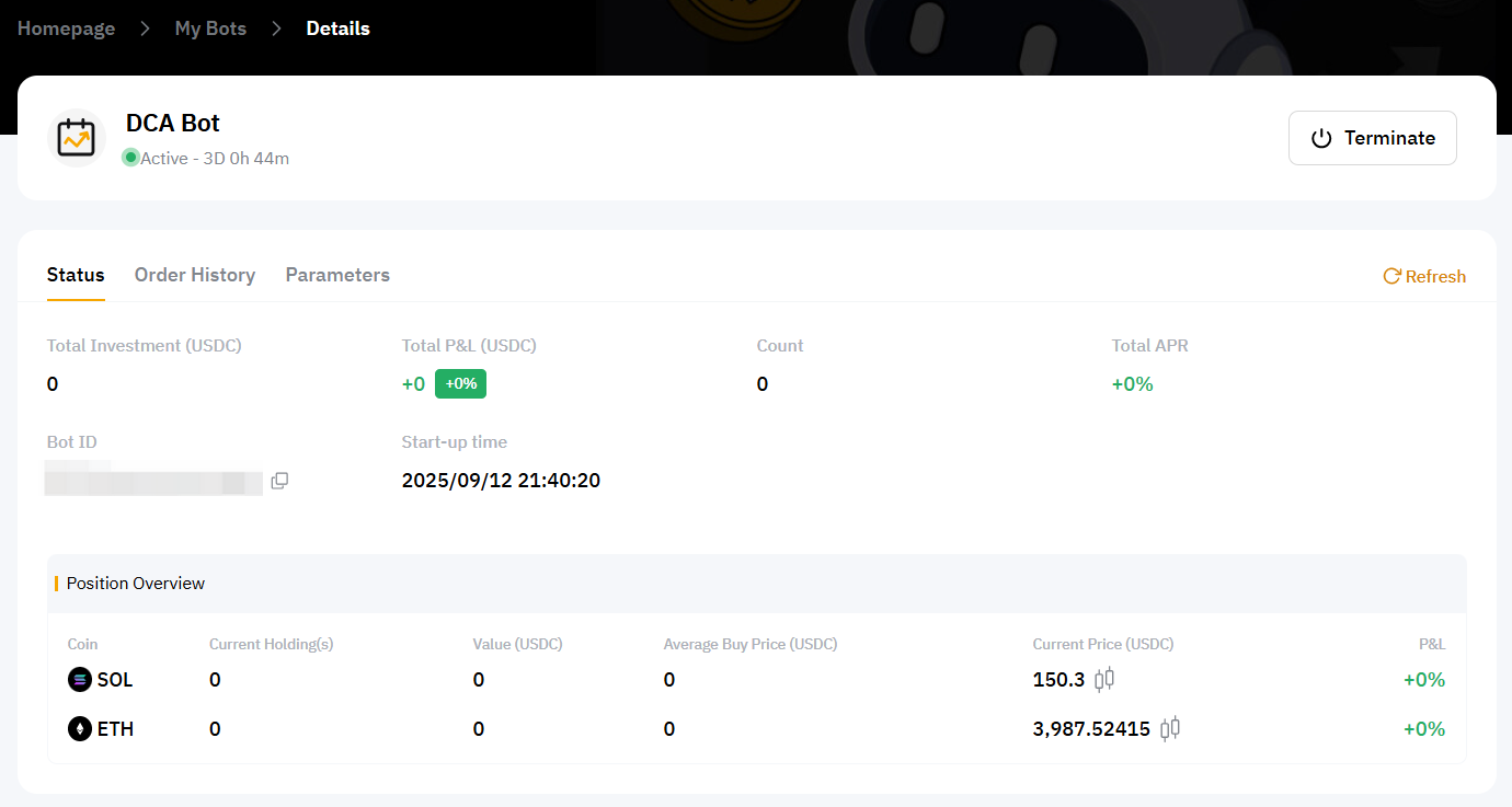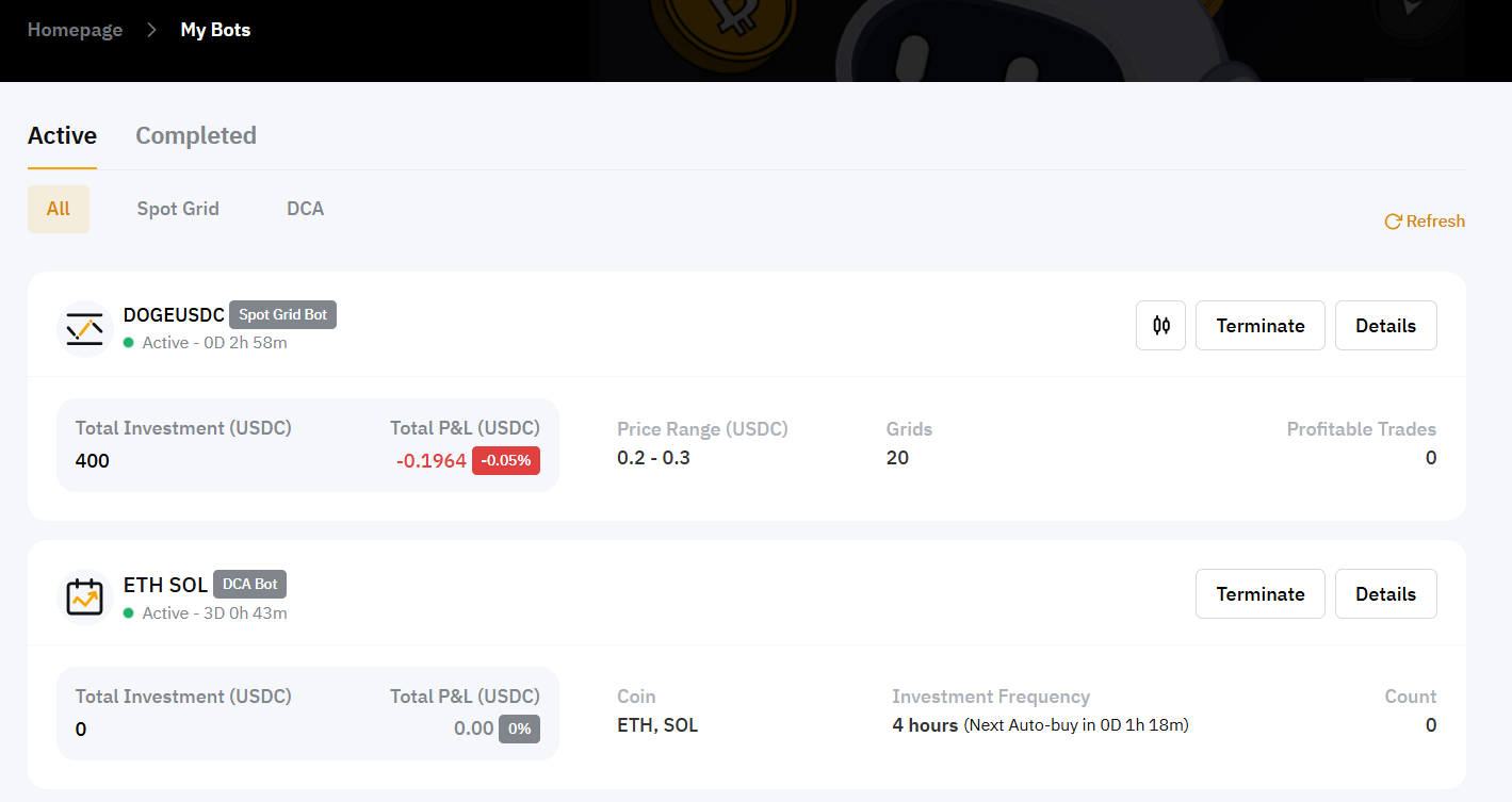 After you click on Confirm, the page will automatically redirect to My Bots for you to view your active DCA bots.