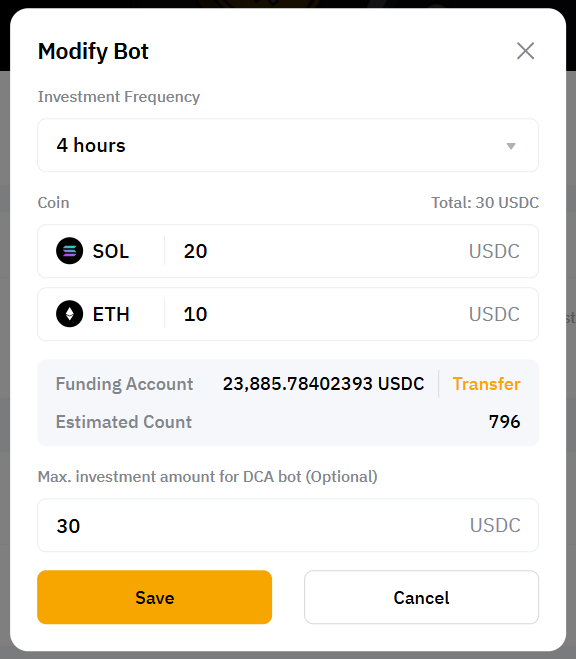 Max. investment amount for DCA bot (Optional): Enter the maximum investment amount that a DCA bot will invest. Please note that the maximum investment amount you enter must be greater than the total investment amount. If the total investment amount triggers the maximum investment amount, the DCA bot will automatically terminate and all assets will be transferred to your Funding Account.
