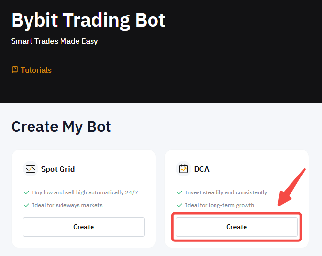 Step 2: Create your DCA bot by clicking on Create to go to the Create DCA Bot page.