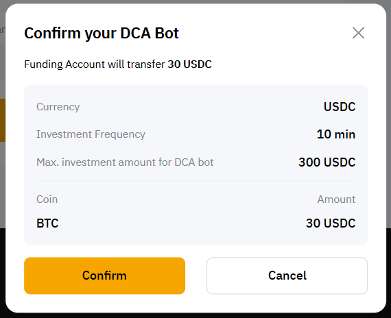 Step 4: Please double-check the DCA bot information you’ve created, and then click on Confirm to start trading.