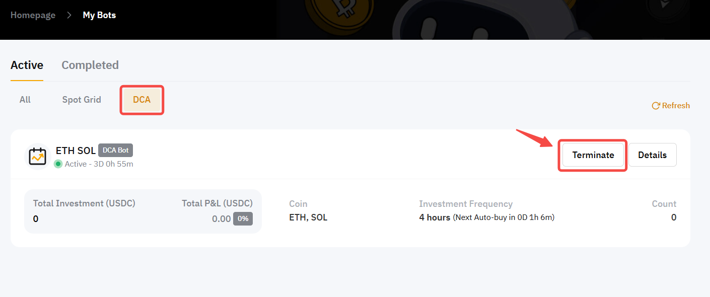 Step 2: Click on Terminate in the upper right corner of the DCA bot column to close.