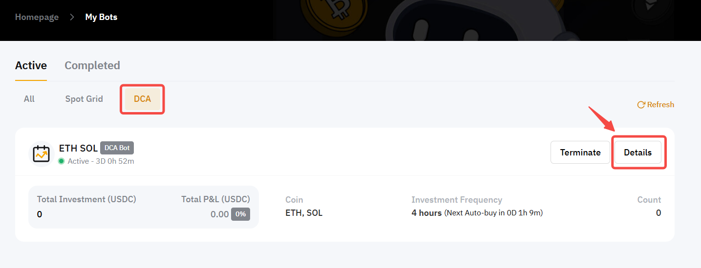 You can click on Details in the upper right corner of the DCA bot you want to view to explore more information, including Position Overview, Total APR, Avg. Price, Executed Quantity and more.