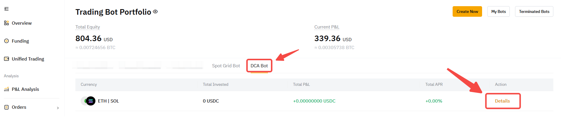 Alternatively, you can view the details of your running DCA bots — Coin, Total Investment, Total P&L and Total APR — under DCA Bot on the Trading Bot Account Assets page. On the Assets page, you can view the Total Equity and Unrealized P&L of all your active trading bots.
