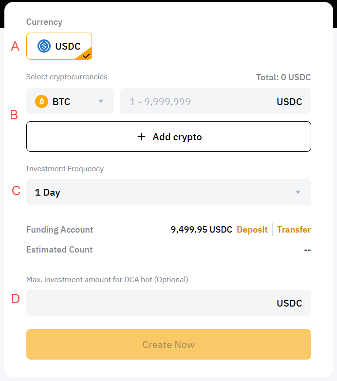 Select Cryptocurrencies: Select the coin you wish to purchase and enter the corresponding investment amount. You can select up to five coins for a DCA bot by clicking on Add Crypto.
