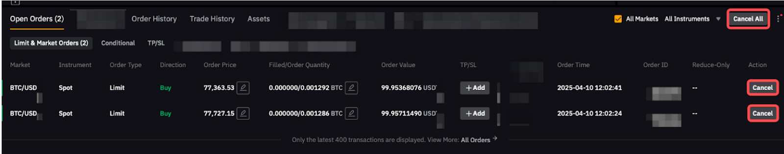 Per annullare gli Ordini Spot, naviga alla scheda Ordini attuali e clicca su Annulla. In alternativa, puoi scegliere di Annulla tutto in alto a destra. È importante notare che se hai selezionato l'opzione Tutti i Mercati, cliccando su Annulla tutto annullerai gli ordini di tutte le coppie di trading.