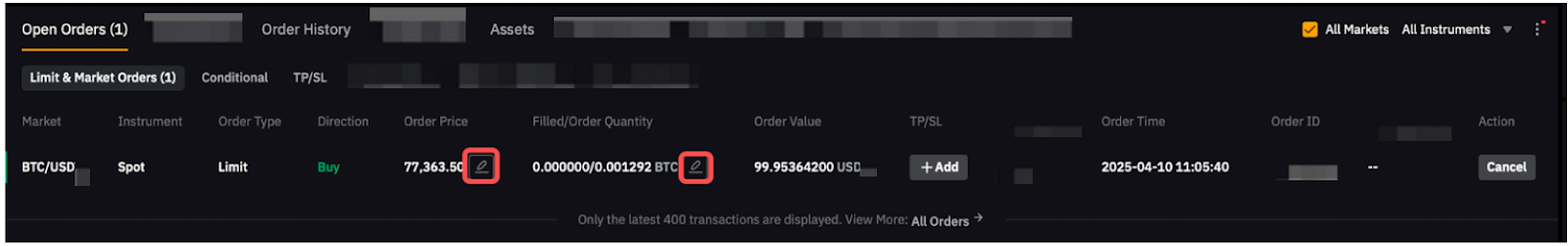 Puoi visualizzare i tuoi ordini attuali, non eseguiti o non attivati nella scheda Ordini aperti. Per mostrare tutti gli ordini attuali per tutte le coppie di trading, puoi selezionare la casella Tutti i mercati. Se desideri limitare la selezione alle coppie di trading Spot, seleziona semplicemente Solo spot nel menu Strumenti.