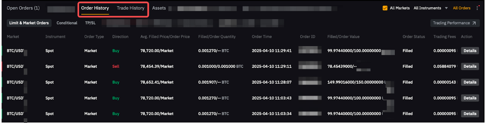 Puoi passare alla scheda Cronologia degli ordini o Cronologia transazioni nella pagina di trading Spot per visualizzare fino a 50 record degli ultimi sei (6) mesi. Simile agli Ordini attuali, puoi controllare la casella Tutti i mercati per visualizzare la cronologia degli ordini o la cronologia transazioni di tutte le coppie di trading e selezionare Solo spot nel menu Strumenti per vedere solo ordini e transazioni passate Spot.