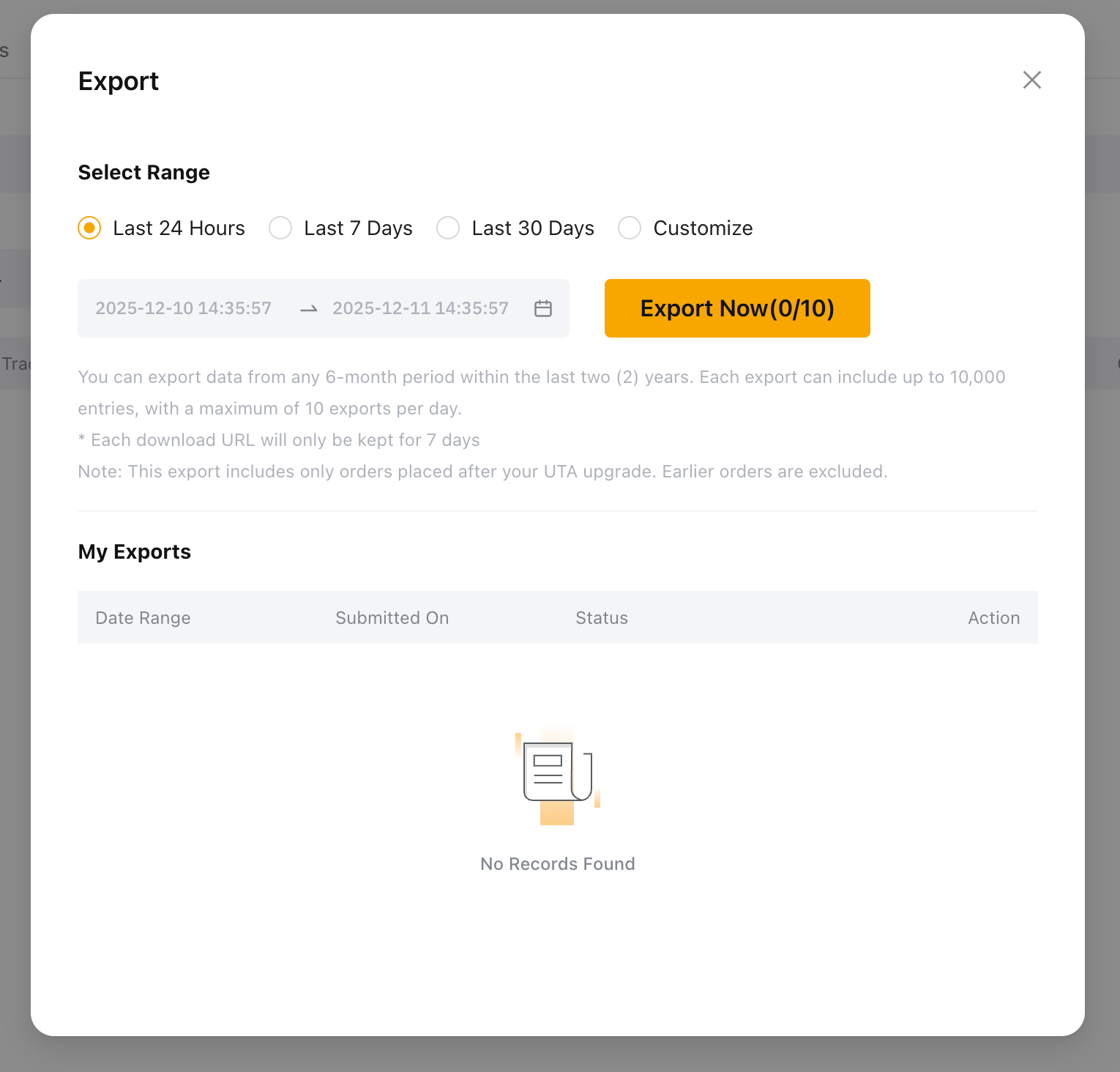 - Vengono visualizzati solo gli ordini annullati negli ultimi sette (7) giorni e possono essere esportati dalla cronologia degli ordini.