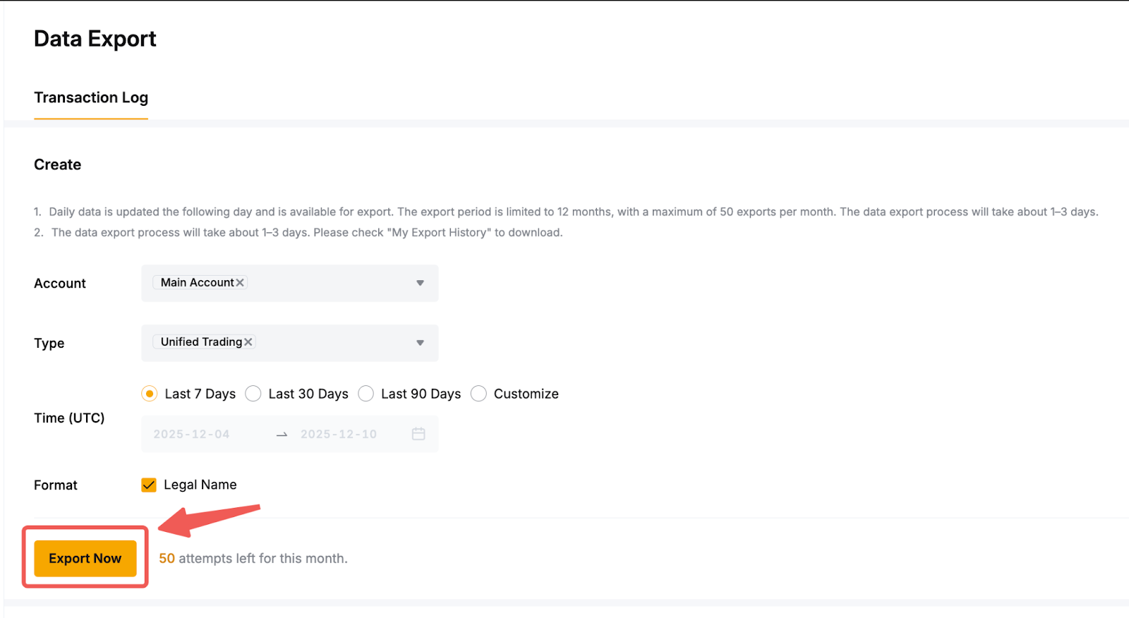 - Per impostazione predefinita, le istruzioni mostrano solo il tuo UID Bybit EU. Tuttavia, è possibile spuntare la casella Nome legale per includere il proprio nome di verifica dell’identità nei dati esportati.