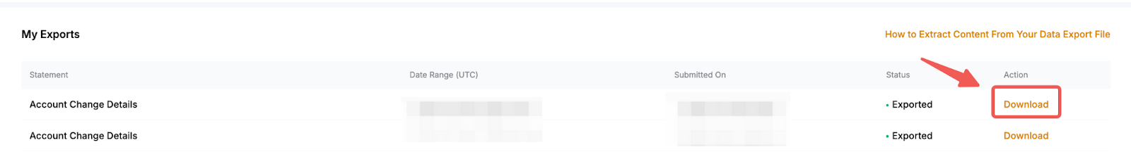 Fase 4: Una volta che il file è pronto, lo stato cambierà in Esportato e il pulsante di download sarà visibile. Inoltre, verrà inviata un’e-mail al tuo indirizzo e-mail registrato. Fai clic su Scarica per ottenere i dati del tuo account.