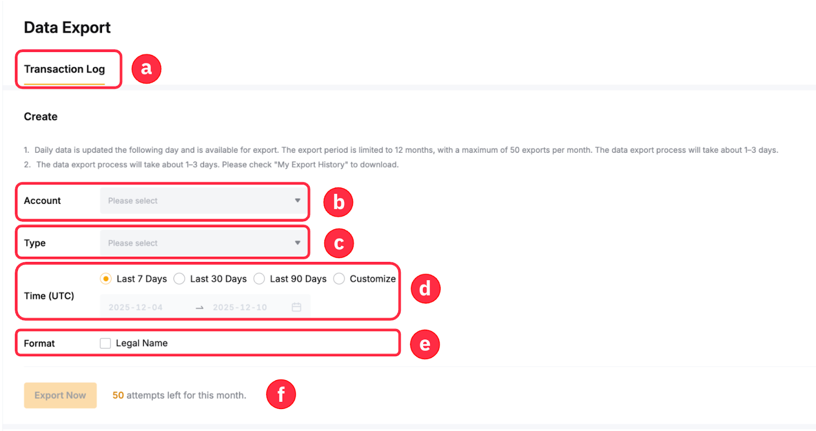 Fase 3: Verrà visualizzata la finestra pop-up Esporta. Selezionare il tipo di contratto preferito, se applicabile, e l’intervallo di tempo. Quindi, fare clic su Esporta ora per generare il file di esportazione dei dati.